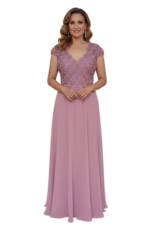 Alquila este vestido largo de fiesta color palo de rosa en encaje con mangas cortas que que hacen lucir tus brazos más delgados tus brazos. Sin duda un vestido muy versátil que sirve tanto para evento en clima cálidos como climas tropicales. Ideal para la mamá del Novio o la Novia.