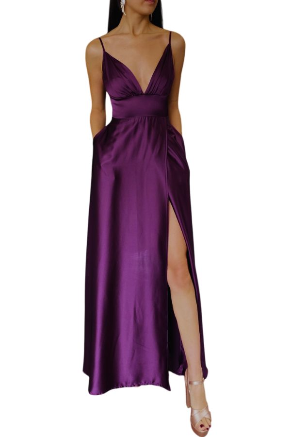 Alquila este vestido de fiesta largo en satin berenjena con escote en V, y abertura frontal y falda tipo A. Un vestido muy versátil para diferentes tipo de eventos.