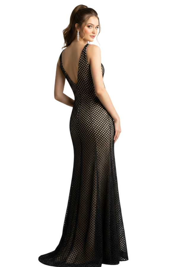 Alquila este vestido de fiesta negro sobre fondo nude, digno de grandes pasarelas. Corte sirena y escote en V profundo. Un vestido recomendado para código corbata negra. Sin lugar a dudas brillaras.