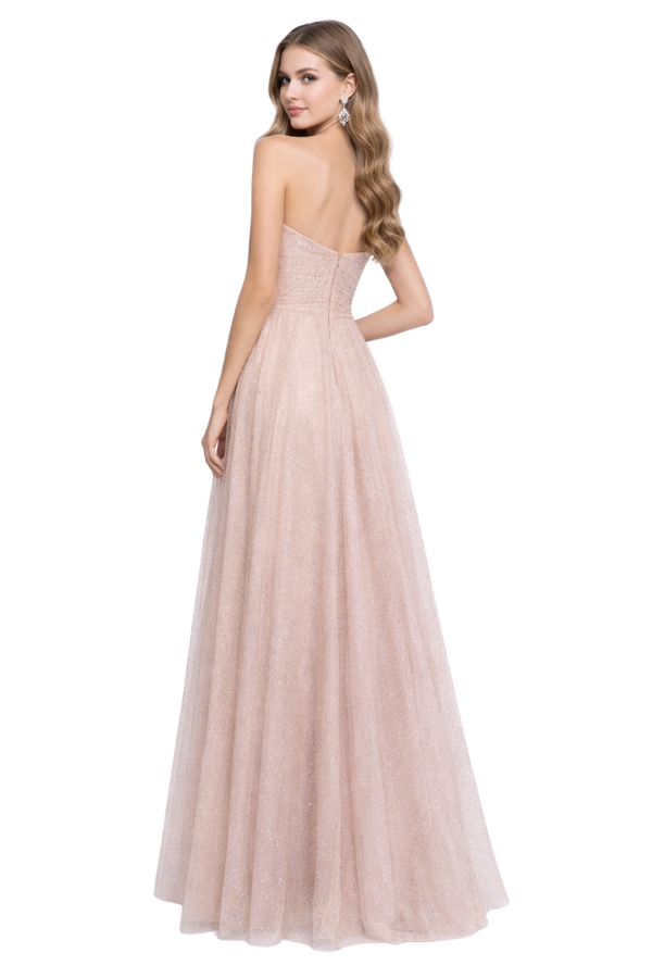 Alquila Vestido de fiesta con escote tipo corazón drapeado y corte princesa en espectacular tul dorado. Un vestido atemporal con el que siempre deslumbraras. Ideal para eventos tipo prom, madrinas de matrimonio.